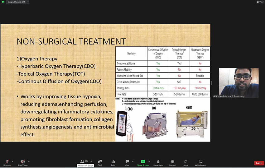 随后,来自马来西亚Tengku Ampuan Rahimah Klang医院创面科、骨科的Dr. Kishen Baboo Ramasamy带来了题为《糖尿病足治疗》的演讲。他结合系统治疗及局部创面治疗,全面地讲解了糖尿病足的治疗方法。