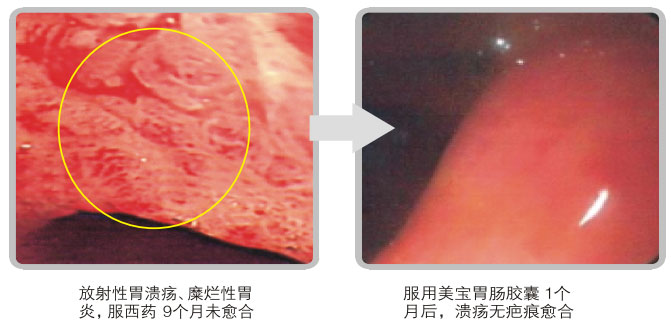 胃肠溃疡是易复发难根治的疾病,其主要原因是:无论是自然愈合还是药物治疗,都是疤痕愈合,特别是药物治疗,其治疗机理大多是设法让溃疡创面疤痕化封闭,尽早解除病人的创面病痛和危险。疤痕愈合后,虽然创面消失,但愈合的疤痕没有黏膜的功能,无自我保护功能,随时可被胃肠内食物或其他因素二次损伤,使疤痕愈合的创面重新发生糜烂、溃疡。美宝胃肠黏膜再生复原技术的科学验证证明,可在已经发生的胃肠溃疡创面上,利用残存的原位活组织细胞和干细胞,重新再生出新的胃肠黏膜,完全不同于药物治疗的疤痕愈合方式。由于溃疡创面始终暴露在胃肠内容物的侵袭下,所以再生复原黏膜的首要条件就是始终隔离溃疡创面不被内容物侵袭,建立黏膜再生的生态环境。同时在此环境下,促进细胞再生新的黏膜,取代溃疡创面,恢复功能。临床功效实验证明,在药物治疗溃疡的同时服用美宝胃肠胶囊(GIC),可使胃肠溃疡创面无疤痕愈合,美宝胃肠胶囊是治疗溃疡药物的最佳伴侣。方法是:不停止原有的药物治疗,每6小时服用5粒胶囊,伴药服,也可单独服,如服用30分钟后症状未缓解,再及时增服5粒,如增服5粒后30分钟仍不见好转,可再增服5粒,直到症状消失,服用周期一般为一个月,较严重和面积较大的溃疡创面可一直服用到创面愈合,不受时间限制。