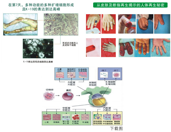 我们关键是要研究第二次再生生命,就是二次再生生命细胞,这个二次生命细胞从哪里产生的?这个细胞可能是在胚胎发育过程中留下来的,因为当时胚胎细胞在发育成人体的过程中,由一个分裂成两个,其中一个继续发育,另一个则不再发育了,好像是睡觉了,一直到人体死亡,这个细胞也没发育过。科学界认为这个细胞是垃圾,我们则认为这个细胞可能就是二次再生生命细胞。这个细胞是那个继续发育的细胞拷贝,当人体细胞发生衰老、损伤、癌变、凋亡时,这个细胞就可以开始启动,发挥作用,原位更新那些受损的细胞。我们今天不在这里详细介绍这个细胞是如何启动的。但告诉大家,这个再生是人的本能,这个本能是时刻都在产生,只不过人体没有发挥,整个世界上的科学家都没有发现到这个细胞是如何活动的,因为有科学家没有实现这个再生的结果,自然不知道这细胞如何活动。有的则是碰上了这个再生结果,觉的不可能又放过去了。总之,都是根本没机会研究到这个细胞。这就像抗生素的发现一样,抗生素天然存在,可那么多年,那么多人谁发现过?大自然中还有很多未知之谜,要不是我们研究烧伤,也不知道皮肤可以再生,要不是破解了皮肤再生的秘密,我就不会想到研究胃肠再生,也不知道胃肠道可以再生,要不是胃肠再生成功了,我也不会想到内脏可以再生,也就不会去研究肝脏,也不知道肝脏可以原位再生复原。这是一环扣一环的,人体里面的这个二次再生生命细胞就是人体再生的秘密,它具有人体完整的信息,可以完整地恢复缺损的组织和器官结构,使人体再生。我们的任务就是如何养好这个细胞,让它有能力在合适的时候启动,原位替代那些异常的细胞,使人体再生。如断指再生,注意我们这可不是断指创面愈合,而是再生复原,生命上没有任何差异,完全是同一个遗传体系。这个二次再生生命细胞,也可能是组织细胞被重新激活回到干细胞特性水平而产生再生作用的,总之,这个细胞来源于组织,待今后的科学进一步研究清楚。