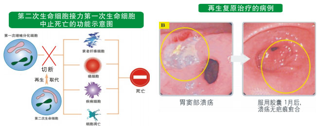 道理讲完了,很简单,没有借鉴别人的理论。再生的关键是技术条件,只要把第一次生命细胞和第二次再生生命细胞喂养好,就能再生。我们简单地总结为三个要素:一是这个细胞的再生能力,就是要让它活;二是再生能源物质;三是再生的技术。喂细胞和喂人不一样,一般情况下大家吃饭都是乱吃,咱们不能光喂第一次生命细胞,还要喂养第二次再生生命细胞,我们就是从这方面出发,两种细胞都喂。这个营养和咱们平时吃的是不一样的,如指头断了后,你使劲吃牛肉、羊肉等,可你的手指头依然不长,其他器官是一样的。所以我们花了很大工夫来研究第二次再生生命细胞的营养谱系。现在参与我们再生复原养生的会员已经都知道了,美宝胃肠胶囊是养我们胃肠的,美宝膳素是养我们全身器官的再生营养物质组合。