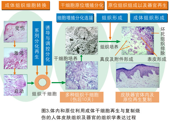 人类组织与器官体内和原位再生、复制的图谱具有代表性,而不同的组织器官有各自的图谱,我们将于近期公布。图3显示的是烧伤的人类皮肤组织器官体内和原位利用干细胞再生和复制的组织学表达过程。