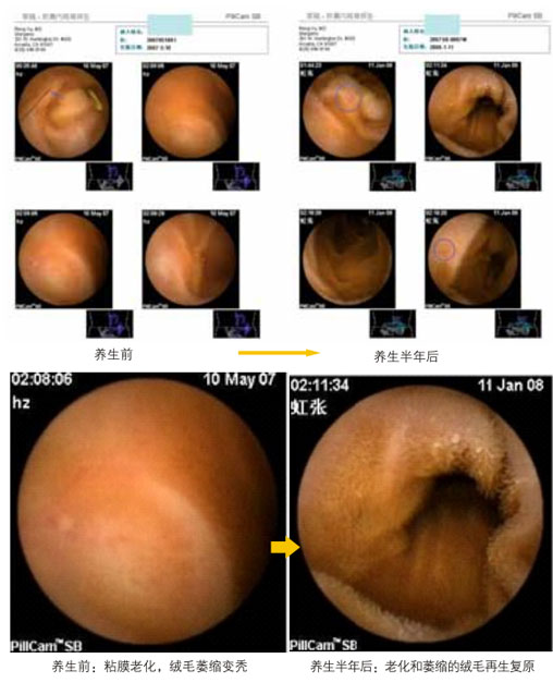 3. 衰老的胃肠粘膜再生复原:衰老的胃肠粘膜能复原回较年轻的粘膜,这在医学和保健学上,从没有人想到。而在本研究的再生复原疗法上,已经实现了。我们的研究表明,人过40岁,人的胃肠粘膜等开始走向衰老,其衰老程序的启动比任何器官都早,过了50岁,人的胃肠粘膜就有约一半的细胞不发挥应有的功能,并且衰老和凋亡了,到90岁,有功能的细胞也只剩下不到10%。我们的研究临床应用结果表明,只要进行半年的胃肠再生复原养生,衰老的胃肠粘膜就能原位再生复原,而后继续保持再生复原养生,就能保障胃肠功能维持在正常较年轻的状态。(图14 为肠镜图片) 衰老胃肠黏膜再生复原