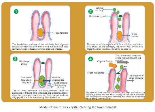 Various components of GIC react to intestinal juice after going through the stomach to the intestine and form the micro wax crystals with the mean size of 30x0.7 μm. These micro wax crystals are in the shape of flower or fiber, which can adhere to the space among villi so that the villi can be opened wider and the absorption area of the gastrointestinal mucosa is enlarged. Meanwhile, the food giblets are cleaned with the movement of the villi after they are wrapped by these crystals.