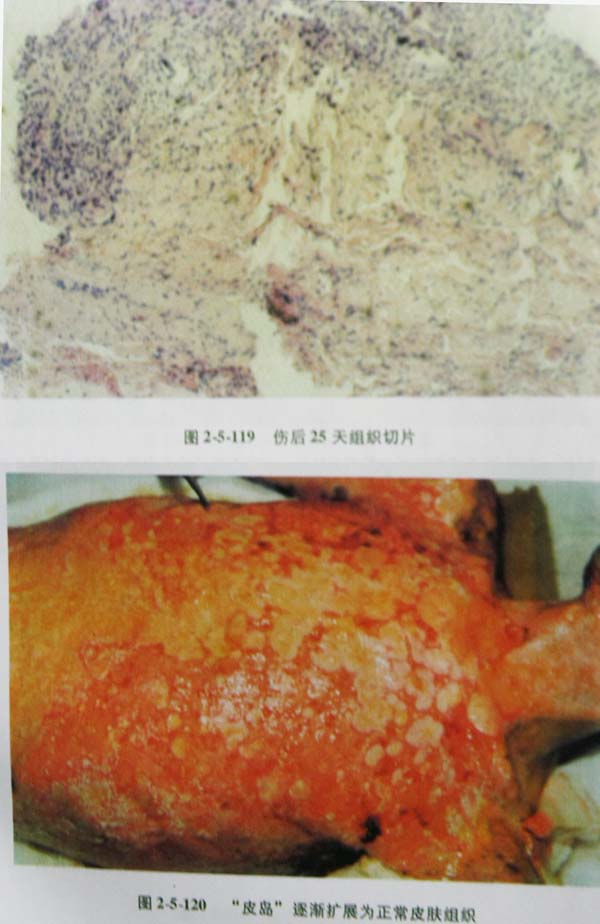 (4)Ⅲ度浅型创面涂药后坏死组织液化的一般规律是:3~5天已去除腐皮的Ⅲ度浅型创面发白或白色。6~10天创面出现颗粒状液化物,量多层厚,持续时间较长。25~35天液化物基本消失,创面新鲜。此时如Ⅲ度偏浅创面,可以继续涂药,观察创面自行愈合情况。也可以同Ⅲ度偏深创面一起,行肉芽创面游离植皮,尽早消灭创面,以缩短病程和力争减少瘢痕形成。