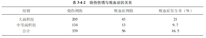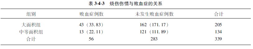 示例345某医院对过去治疗的烧伤并发败血症的病例进行回顾性总结,205例大面积烧伤病人并发败血症的例数为43,而134例中等烧伤面积病人并发败血症的例数为13,问败血症的发生与烧伤面积有无关系?