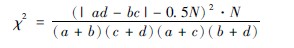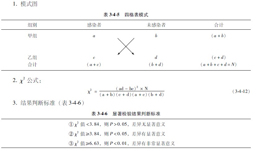 四格表资料的χ2检验法是应用最为广泛和最为方便的一种方法,它所检验的仅是两个率的比较。基本模式图、公式和结果判断标准如下: