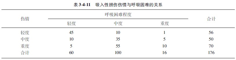 示例3410(计数资料相关分析):某烧伤中心观察了176例吸入性损伤病人的不同伤情与呼吸困难的各自例数,问呼吸困难程度与吸入损伤伤情之间有无关联性(数据资料汇于表3411中)?