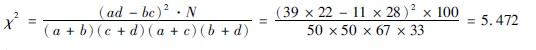 5确定P值:n′=1,查χ2值表(344),χ2005=3841,χ2001=6635,本研究6推断结果:在α=005水准上,拒绝H0,接受H1,因P<005,差异有显著性,故认为两种诊断程度关联密切。