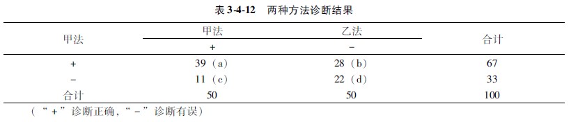 第一步:分析两种诊断结果有无相关关系,每个对象按两种处理结构分组,故可用四格χ2检验公式计算,推断两种诊断方法之间有无相关关系:
