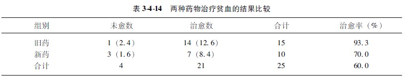 示例3313:某医生用新旧两种方法治疗烧伤后贫血病人共计27例,结果汇于表3414中,问新旧药物的疗效有无差异?