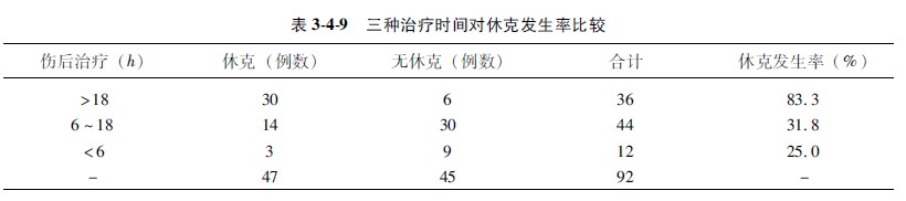 1建立检验假设:设H0:三种不同治疗时间休克发生率相等;设H0:π1=π2;三种不同治疗时间休克发生率不完全相等,H1:π1≠π2。