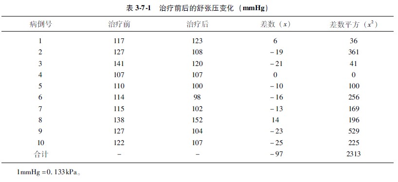 示例37410例高血压病人采用A种降压药物治疗,治疗前后的舒张压变化结果记录于表371中。问A种降压药物治疗后的舒张压变化与治疗前有无显著性差异?