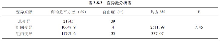 组间和组内离均差平方和除以相应的自由度,即得“组间均方”和“组内均方”。以组内均方除组间均方所得之商即为F值。方差分析模式于下(表382):