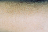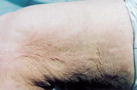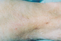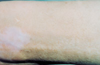 7. 深Ⅱ度、浅Ⅲ度混合度创面(右前臂及腕部屈侧)自行愈合后3年,皮肤结构大部 分正常,部分色素缺失