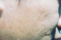 8. 浅Ⅲ度创面(右面部)自行愈合后3年,皮肤结构基本正常,毛发生长,汗腺分泌