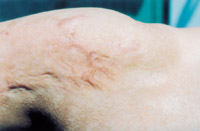 8.深Ⅲ度创面(右大腿及膝关节内侧)自行愈合后3年,瘢痕平整柔软,无挛缩,不影响功能