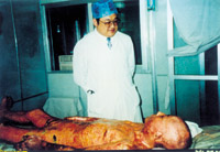 作者:中国中西医结合学会烧伤专业委员会 出版社:中国医药科技出版社 发行日期:2000年6月烧伤湿性医疗技术用于治疗大面积烧伤,一般不受医疗条件的限制,只要该医院具备一般外科治疗条件,均可进行大面积烧伤治疗,特别是不强调无菌隔离环境条件,只强调室内温度和细心的护理,及时清理创面液化物,遵循外科系统治疗原则,均能立足于本单位条件抢救治疗大面积烧伤。下图是烧伤湿性医疗技术发明人徐荣祥教授在治疗查看烧伤总面积100%的深度烧伤病人时的情景。