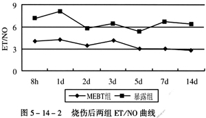 (1) 血浆ET、NO测定结果:正常人血浆ET值42.8±12.2pg/ml,NO值14.5±3.6mol/L,ET/NO之比约为2.95。表5-14-3见两组伤后8h血浆ET迅速上升,但MEBT组在各时相上升水平均低于干燥暴露疗法组,5天后恢复到正常水平,干燥暴露疗法组在伤后14天仍维持较高水平。表5-14-4见两组伤后8h血浆NO均迅速上升,1天起MEBT组逐渐下降,3天后恢复到正常水平,干燥暴露疗法组7天后才恢复到正常水平。图5-14-2见MEBT组1天后ET/NO就趋向于2.95,而干燥暴露疗法组各时相ET/NO远高于2.95。