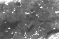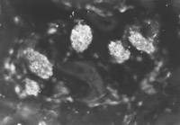 用特异的小鼠抗人角蛋白19型的单克隆抗体(McAb)对正常和烧伤皮肤免疫细胞化学观察结果表明,两例正常皮肤表皮再生干细胞数量较少,可见少量显示荧光的表皮细胞再生干细胞(图5-4-1),即角蛋白19型阳性细胞。烧伤后24h,荧光显微镜下,显示荧光的表皮再生干细胞数量中等程度(图5-4-2),烧伤后4天,在汗腺、毛细血管和毛囊周围可见开始增多的潜在表皮干细胞(图5-4-3)。