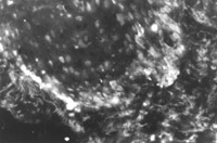 2. 生物素—抗生物素蛋白DCS体系间接免疫荧光染色 先将冰冻切片用10%的马血清于4℃孵育20min,然后滴加1:20稀释的小鼠抗人角蛋白19型单克隆抗体(第1抗体)4℃孵育过夜。切片在磷酸缓冲液中涮洗后加第2抗体,即7.5礸/ml生物素化的马抗小鼠IgG抗体(Vector Laboratories Burlingame, CA, USA),4℃孵育1h。涮洗后,加10礸/ml荧光素-抗生物素蛋白DCS(Vector Laboratories Burlingame, CA, USA)于4℃孵育1h。将切片涮洗干净后,用含10%PBS和1%对苯基二胺(P-phenylenediamine)的甘油做介质封片。对照染色切片,则不加第1抗体。标本在Olympus反射式荧光显微镜下观察,并用ASA400 KODAK胶卷照相。