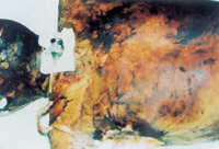 患者入院时,病情严重,处于休克状态。大面积深度烧伤创面被水泥粉贴覆,鼻毛烧焦,水泥呼吸道吸入,呼吸音变调,声音嘶哑,紧急作气管切开,对创面行MEBT/MEBO加耕耘疗法治疗,对全身进行综合治疗,创面组织学检查为Ⅲ度烧伤。