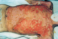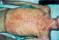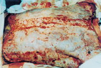 一位12岁的女孩全身81%面积Ⅲ度烧伤,利用规范的创面覆盖技术和CCA技术成功地封闭了创面。进行筋膜切除和同种异体皮移植覆盖后,将自体皮置于她背部的烧伤处,然后将7500cm2的CCA置于其正面烧伤的胸部、腹部和下肢。60%的面积覆盖了CCA,成功率达40%。没有出现感染的症状,甚至在CCA未成活的地方也是如此。尽管在这些CCA移植失败的部位也偶尔发生上皮化,似乎更有利于移植自体皮。在大面积深度烧伤中,先进行早期清创和同种异体皮移植,随后进行常规的自体皮植皮和CCA移植,可提供一个有效的皮肤覆盖方法。