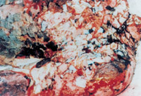 3-6 处理结果:烧伤皮肤及未烧伤的皮下组织均被切除,胸部烧伤创面变成人为的外科手术切除的肌肉层创伤创面,已无任何烧伤组织及皮肤组织。