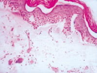 5-2-3 伤后第3天,表皮细胞空泡化,真皮浅层胶原纤维玻璃样变,真皮内散在炎细胞浸润 HE×100