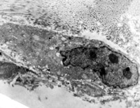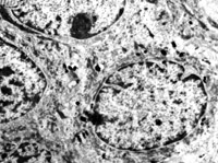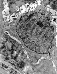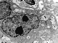 5-2-8 伤后第10天,皮肤附件上皮细胞成簇分布,核仁边集,内质网扩张,胞质内含较多张力原纤维 TEM×6000