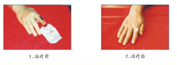 女性患者,57岁,食指末节离断缺损,于2003年6月27日就治于山东省荣成人民医院,经使用MEBT/MEBO治疗。创面30天后愈合, 食指末节再生,恢复了正常的形态和功能。