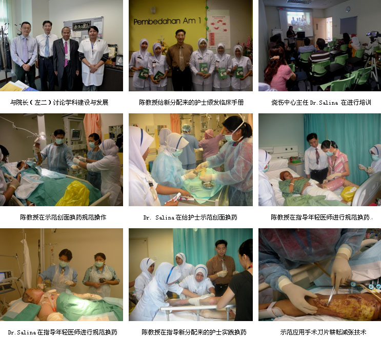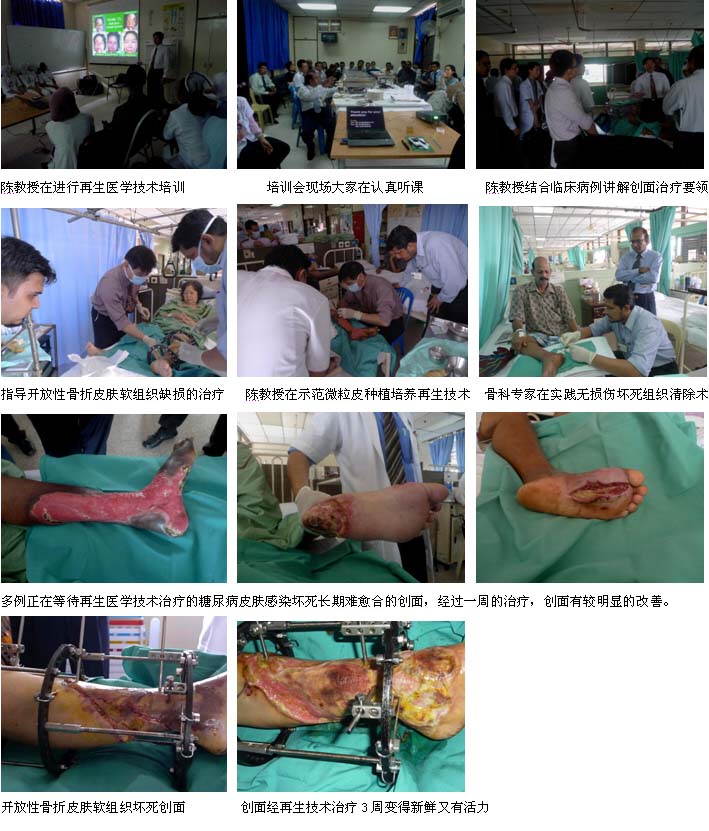 3、2010年4月14日和4月20日,马来亚大学医院再生医学技术外科护士和烧伤整形科医师培训班分别在医院的阶梯教室和外科教研室举办,护士培训班由医院护理部主任Mrs.NG Mooi Eng主持,60多名来自外科系统的护士参加了培训班,而烧伤整形科医师的培训班则由烧伤科主任Dr. Alizan主持,20多名烧伤整形科和创伤骨科医师参加了培训班,培训班既有精彩的演讲培训,又有临床病例示范,生动易懂,很受欢迎。培训班和临床病例会诊、示范结束后,陈教授在主任的带领下,应邀到大学实验室参观和指导进行临床应用研究等工作,听了陈教授对以后科研工作的初步设计后,大家都非常兴奋和激动,希望能够尽快开展和完成临床应用研究,并将研究成果汇报给国家卫生部,为将来该技术在马来西亚的推广应用做准备和打下科学基础。这2次的培训班为进一步规范该教学医院的创面治疗技术和提高烧伤病人的救治水平起到了积极和关键的作用。