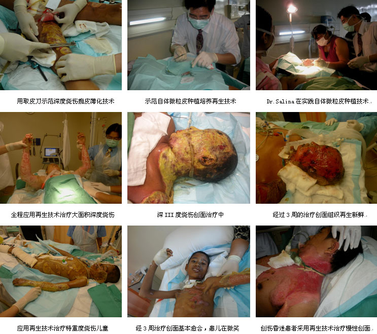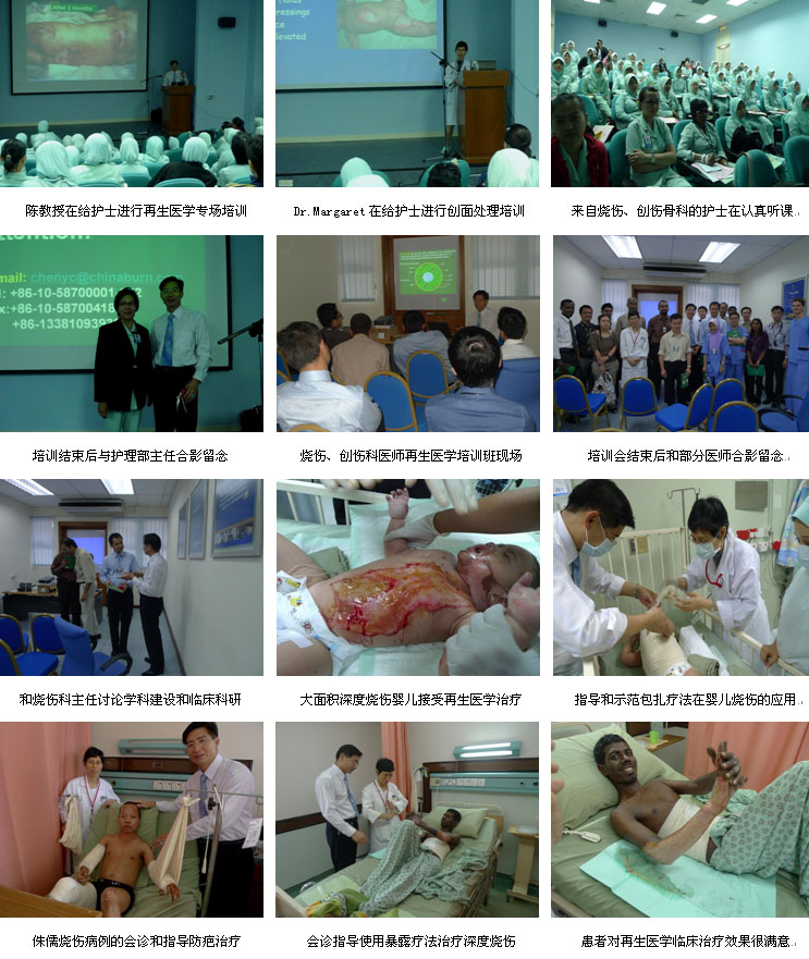 医院,800多病床)的烧伤中心建设、医护人员培训、临床病例的会诊救治、媒体宣传的组织策划等工作均收效显著。这次对重点医院的技术支持和帮助,主要是针对新成立烧伤中心后的进一步规范烧伤再生医学技术在该中心的应用而安排的,中国烧伤创疡科技中心临床部主任、北京荣祥再生医学研究所副所长陈永翀教授承担了这次技术支持任务,同时烧伤中心主任Dr. Salina 结合自己的经验和陈教授积极配合,对全科的16名医护人员进行了较系统和全面的烧伤、创疡和疤痕治疗的再生医学技术培训、病例讨论、会诊指导和现场示范等。期间,陈教授还约见了医院的院长Dr. Khalid Ibrahim,介绍了徐荣祥教授发明创立的烧伤再生医学技术的特点与临床应用的真实效果,以及陈教授在中国和部分国外的国家,利用烧伤再生医学的技术优势,帮助多家医院成功建设发展烧伤中心的经验,与院长就下阶段烧伤中心的建设与发展问题进行了深入的研究和讨论,确定了烧伤中心未来的发展方向和目标。院长表示一定将国际领先的烧伤再生医学技术作为烧伤中心发展的根本,全面支持烧伤中心的建设与发展。