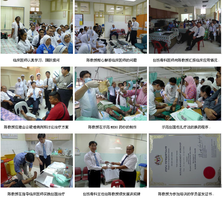 5、2010年4月21日,Hospital Sultanah Aminah Johor Bahru省政府医院的培训班在该院的创伤骨科教研室举办,创伤骨科主任Dr. Theva组织和主持了培训会,全科60多名创伤外科医护人员参加了培训会,培训会期间还组织了多个病例讨论和创面换药操作示范。期间,更具该院断指病例很多的情况,陈教授还同科主任共同讨论、设计了断指再生临床对照研究的科研项目,陈教授不仅传授了再生医学技术给创伤骨科的医护人员,同时也调动了大家的科学研究的激情,开发效果很好。