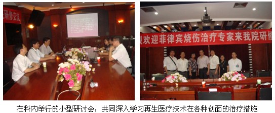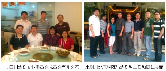 2011年6月19日至7月2日,菲律宾两名高年资烧伤整形科专家,Dr. Mijares及Dr. Sy分别来到中国中西医结合学会基地医院:四川省南充市川北医学院附属医院及雅安市人民医院进行参观学习再生医疗技术,中国中西医结合学会烧伤专业委员会四川分会的胡栋材教授,邱为东秘书长,川北医学院附属医院烧伤科主任周国富教授,雅安市人民医院烧伤科主任兼烧伤专业委员会副主任委员付子俊教授热烈欢迎并进行了大量的学术指导和生活。中国中西医结合学会烧伤专业委员会对外办公室舒叶陪同翻译。
