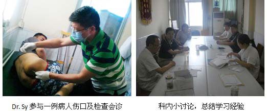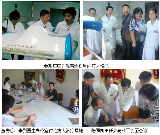2011年6月20日至6月24日,两名国外专家在南充市川北医学院附属医院烧伤科参观学习。其间,在周国富主任医师,项晓燕主治医师,陈刚主治医师及其他科内医护人员的带领下,外国专家每天到病 房观察烧伤病人创面在再生医疗技术的帮助下,如何一天天原位再生复原;同时,为了更好的达到此次学习目的,在科内专门组织了数次科内的小型讨论会,专门对大面积烧伤患者系统治疗方面如何进行补液,抗感染等要点作了深入的研讨;通过深入回顾科内年初成功抢救的一例大面积烧伤患者的病历资料,国外专家对系统治疗的要点有了深刻的把握,尤其是与传统方法的区别。