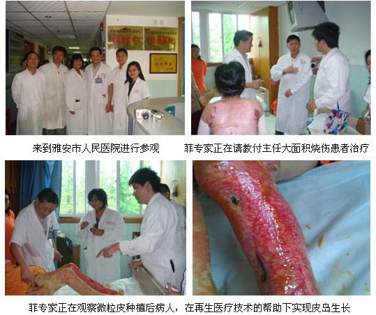 2011年6月27日至7月2日,两名专家来到雅安市人民医院烧伤科进行学习再生医疗在介绍了微粒皮种植的流程;其间有一例患者正从微粒皮种植的手术中逐渐恢复,伤口上生长的皮岛正在连接成片。付主任解释说,如果按照传统的方法换药,种植的微粒皮是不可能在创面上存活并且生成皮岛,正是有了再生医学技术独有的干细胞培养过程,才使得微粒皮种植培养皮岛得以实现。此外,除了烧伤病人,各种外伤及慢性创面患者也都在再生医疗技术的帮助下获得了良好的治疗和康复。Dr. Mijares尽管只有一年再生医疗技术的使用经验,但仍然惊讶于再生医疗技术在多学科应用所取得的成就并且表示回国后将致力于再生医学在菲律宾的发展。
