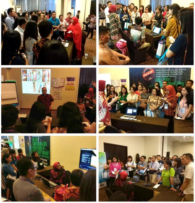 会议中,来自雅加达的Dr. Vika Tania/Dr. Afriyanti Sandhi/Dr. Aditya Herwandar讲解了烧伤创疡人体复原的基本理论; Dr. Aditya Herwandar/Dr. Donna Savitry/Dr. Puri Ambar Lestari则就创疡的再生医学基本护理进行了阐述;Dr. Donna Savitry/Dr. Laksmi Achyati/Dr. Afriyanti Sandhi则以再生医学烧伤的基本护理为主题展开论述;而Dr. Vika Tania/Dr. Puri Ambar Lestari则通过烧伤病例的分享让大家更好的了解这一技术;Dr. Mendy H.Oley/Dr. Maximillian Ch.Oley则分享了治疗过程中控制疼痛的方法。随后在场200余位参会者分六组进行了讨论,以烧伤在不同场景和情况下的急救措施和后续护理为重点进行了热烈的交流。