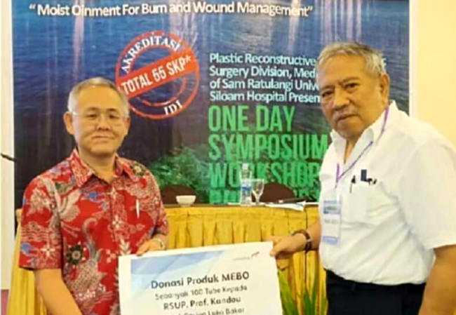 会后,由Combiphar公司总裁 Mr. Wong代表美宝国际向Siloam医院捐赠了100支烧伤膏,旨在让当地贫困患者也能享受到再生医学的成果。