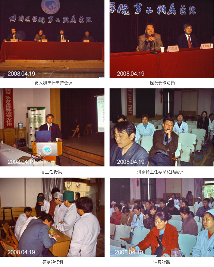 2008年4月19日蚌埠市暴雨,学员仍冒雨参加上午由中国中西医结合学会烧伤专业委员会主办,蚌埠市医附二院承办的《烧伤皮肤再生医疗技术诊治护理培训班》在医附二院会议厅隆重召开。出席这次培训班的有医学会外科分会主任委员刘金新、医院领导程新德院长。外科主任贲大刚主持会议,程院长首先对再生医学技术疗效显著、应用简单方便,非常适合基层医务人员的特点给与了充分的肯定并作简要动员。同时勉励广大学员珍惜这次学习机会,通过这次会议开阔医学发展视野、了解医学发展动态、掌握实用医疗技术。来自全市基层医院、乡镇卫生院、临床一线医护人员共150多人。