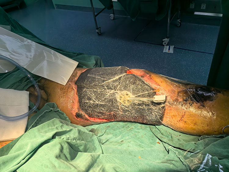 10月10日,应长治市人民医院急诊邀请,《中国烧伤创疡杂志》常务编委、烧伤创疡再生医疗技术临床专家赵瑞庆,会诊一例装载机碾轧伤工人。次日在全麻下行双下肢大腿内侧,外侧坏死组织清创术,事后使用vsd装置,术后制定了详细的治疗方案。