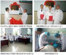 揭牌仪式由中心医院负责烧伤工作的程显主任主持,下午2点随着大家掌声的响起揭牌仪式正式开始。于海院长与中国中西医结合学会烧伤专业委员樊教授共同揭牌,揭牌仪式场面很是热闹。樊教授现场为于海院长与程主任赠送了徐教授组织撰写的《烧伤治疗大全》。