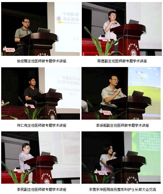 王洪生研究员首先以“烧伤皮肤原位再生复原技术在重度以上烧伤系统治疗的要点”为题进行了专题学术讲座;随后,唐乾利教授讲解了“皮肤溃疡创面处理的中西医基础与临床研究近况”;王达利教授讲授了“瘢痕疙瘩来源干细胞的生物学特性鉴定”;贺全勇教授讲授了“烧伤感染的防治”;谭军教授讲授了“点阵激光治疗增生性瘢痕”;张一鸣教授讲授了“烧伤瘢痕的外科治疗”; 省内专家广东省中西医结合学会烧伤专业委会副主任委员、中山大学附属五院烧伤整形科主任辛俭副主任医师;广东省中西医结合学会烧伤专委会副主任委员、深圳阳光医院院长张华彬主任医师;广东省中西医结合学会烧伤专委会副主任委员、深圳市第六人民医院梁智主任医师;广东省中西医结合学会烧伤专委会副主任委员、广东医学院附属惠州医院(惠州市中心医院)烧伤整形科主任徐俊赐主任医师;广东省中西医结合学会烧伤专业委员会常委、深圳市龙岗中心医院烧伤整形科主任陈茵副主任医师;广东省中西医结合学会烧伤专业委员会委员、佛山南海人民医院烧伤整形科主任李民副主任医师;广东省中西医结合学会烧伤专业委员会常委兼秘书、中山黄圃人民医院皮肤与烧伤创疡科主任何仁亮主任医师;广东省中西医结合学会烧伤专业委员会常委、开平市妇幼保健院院长李活船副主任医师分别以“小儿重度烧伤治疗”、“皮肤扩张技术在烧伤瘢痕中的运用”、“皮肤圆锥体结构的病理学观察”、“皮肤微粒皮种植修复大面积烧伤创面”、“中西医治疗烧伤脓毒症”为题进行了专题讲座。在学术讲座中来自国内各省的专家利用大量详实的图片资料,重点向与会的专家、学者和医护人员讲述了烧伤皮肤原位再生复原医疗技术等中西医结合方法在特重度烧伤并发症及增生性瘢痕防治方面的进展,由于学术讲座重点突出、内容丰富、贴近临床,方法简便实用、临床效果显著,与会代表反映强烈。学习班结束后,学员们进行了广泛而深入地交流。