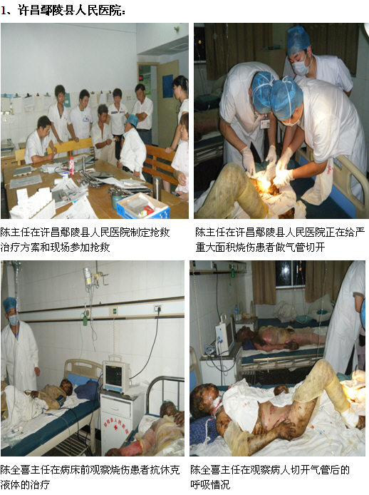 赤日炎炎似火烧,夏伏盛日温度高。2010年7月11日至28日,中国中西医结合烧伤专业委员会委员,全国特重病人抢救组专家,皮肤原位再生医疗技术推广专家陈全喜主任别对河南省鄢陵县人民医院、河南省鹤壁市第二人民医院、河南省滑县第三人民医院河南省许昌市地铁骨科医院的烧伤科进行了会诊,其中比较典型的病例如下:1、河南省鄢陵县人民医院2名火烧伤患者,烧伤面积均为96%TBSA以上的特重度烧伤患者;2、河南省鹤壁市第二人民医院患者杨某,男,22岁,热水泥烧伤,总烧伤面积为67%TBSA,均Ⅲ度烧伤创面;3、河南省滑县第三人民医院患者郭某,女,54岁,热液烫伤,烧伤总面积为68%TBSA,双下肢均为深Ⅲ度烧伤创面(肌腱外漏);4、河南省许昌市地铁骨科医院张某,男,38岁,外伤引发骨髓炎,住院已9个月,病情进一步恶化。