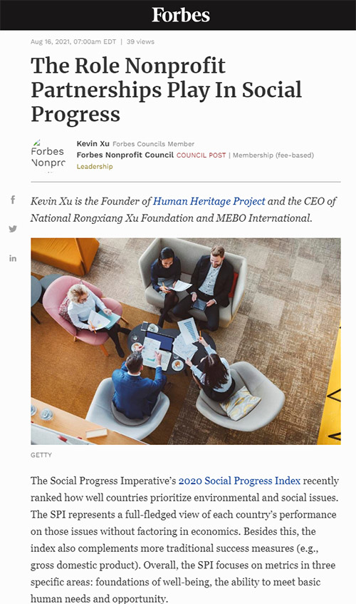 2021年8月16日,美宝集团34周年纪念日,《福布斯》特别刊发美宝集团董事局徐鹏文章——非营利伙伴关系在社会进步中的作用。徐鹏希望通过非营利组织,提高国家的社会进步指数(SPI)。