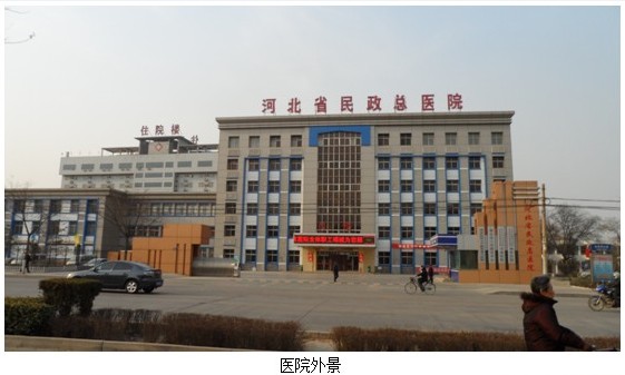 河北省民政总医院是由原河北省复员军人医院和河北省荣誉军人康复医院整合而成。医院技术力量雄厚、专业科室齐全、医疗设备先进,是集医疗、科研、教学、预防保健和康复医疗于一体的现代化综合医院。医院坐落于邢台市区西北(桥西区泉南西大街293号),环境优美、交通便利、医疗建筑面积近4万平方米,有急诊楼、门诊楼、医技楼、康复楼、住院楼、颐康楼及其他配备设施。编制床位800张。现有职工700余人,其中高级职称124人,中级职称161人。