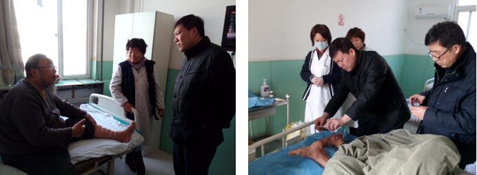 在综合内科病房,杨智斌董事长和陈全喜主任重点查看了几个典型病例的情况,有几位糖足、压疮患者的创面情况比较复杂,杨总亲自拍照留取图片资料,以便将把这些资料转发给集团总部相关课题研究组的专家,帮助医院寻求更精准的技术指导。
