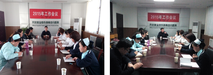 下午4时30分,医院2015年工作会议在行政楼四楼小会议室召开,会议由医院前任院长王文芳主持。首先,宣布了一系列新的人事任命:任命开封空分集团有限公司工会主席、厂办主任李润喜为开封美宝烧伤创疡空分医院副董事长;任命王文芳为医院党支部书记、董事;任命王志英为医院代理院长;任命朱登玲为副院长;任命郑玉红为院长助理。并宣读了相关职责及分工。随后,代理院长王志英做2014年工作汇报,总结了医院一年来的各项计划、任务的完成情况,并对2015年的工作进行简要部署。会上,各相关科室负责人也分别提交了2014年工作总结和2015年工作计划。针对当前医院发展中存在的一些突出问题,与会人员畅所欲言,纷纷表达自己的理解和看法。对于美宝再生复原技术在治疗烧伤创疡疾病领域内的卓越效果,大家早已达成高度共识;对于如何将其更好应用于临床,大家也都结合各自的实际工作发表了建议。