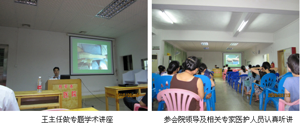 学术讲座于2010年8月13日晚上7:30分在该院门诊五楼会议室进行,该院医务科李志腾科长全程主持了学术讲座,该医院副院长兼创伤外科主任陈祖彦、副院长向爱民、创伤外科副主任李康土等院领导及60余名相关科室的专家和医护人员到会聆听了学术讲座,在专题学术讲座中王主任结合了大量的临床病例资料,主要针对各类难愈性创伤、溃疡创面的规范化处理方法与技巧、注意事项等进行了细致地讲解,通过本次学术讲座,使该医院的相关医护人员加深了对再生复原疗法在难愈性创疡创面的临床治疗要点和技术操作规范的了解,为该院处理难愈性创面拓展了新的思路。