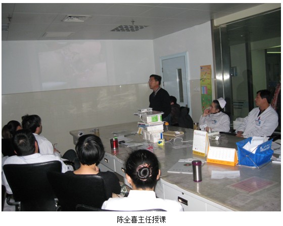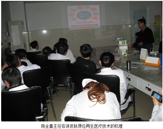 下午两点, 皮肤原位再生医疗技术培训班在本院外科医办举行。参加医师18人,护士长3人,主任3人,副主任3人,医政科长1人,共28人。副主任医师陈全喜说:“人体再生复原科学是中国生命科学家徐荣祥教授创立的。我今天讲人体再生复原科学的一部分—— ‘人体皮肤原位再生医疗技术’在临床已成为一项成熟的国际性技术(治疗各类烧伤创面,皮肤溃疡创面,糖尿病坏死足创面,周围血管病创面,动脉闭塞症,血管狭隘性的诱发的创面,各种创面难愈合性创面,感染后长期不愈合的创面和外伤感染性创面,新鲜创伤创面)。陈全喜图文并茂的演讲,取得了很好的现场效果,听课的医师被徐荣祥教授创立的人体皮肤原位再生医疗技术所震惊。提出了很多问题,陈全喜主任都认真一一解答。李建民业务院长说:“我来晚了,听了一半,希望在您的空闲时间,2013年元月给我们再讲一课,让我们了解更多的科学技术,陈主任则爽朗的回答,下次将把人体再生复原科学的胃肠再生技术传播给各位医师,培训在一片掌声中结束。