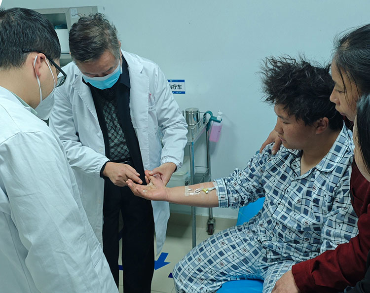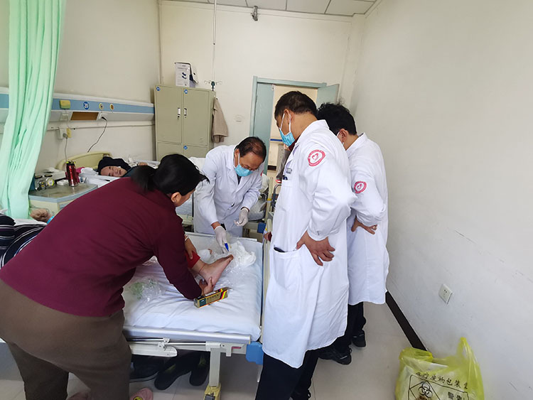 11月6日,《中国烧伤创疡杂志》编委、烧伤创疡再生医疗技术临床专家张强主任应邀到访英山县人民医院,参与会诊一位电击伤患者。张主任与临床工作人员一起了解患者受伤情况,认真细致检查伤口,并共同商讨制定了治疗和后期康复方案,得到患者家属和临床人员的一致好评。